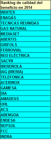 Vemos que en el caso de ocho empresas todo, o casi todo, el beneficio neto declarado coincide con el recurrente. Se trata de Inditex, Jazztel, Enagás, Técnicas Reunidas, Gas Natural, Bolsas y Mercados Españoles (BME), Telecinco y Abertis. Podemos decir que los beneficios de estas empresas son de alta calidad. Aunque Jazztel y BME ya no están en el IBEX este semestre, han sido incluidas en el estudio.