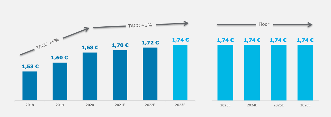 Se espera un dividendo a cuenta de 2022 de 0,688 € en diciembre de 2022 y un complementario de 1,032 € en julio de 2023.