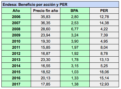 Endesa logró lo que parecía improbable este año: superar los resultados de 2016. En el primer semestre de 2017, el beneficio por acción interanual fue de 1,20 € y en el tercer trimestre del año, dicha magnitud fue menor aún, de 1,12 €, debido a las complicadas condiciones del negocio a lo largo de 2017. Finalmente, el beneficio por acción de 2017 ha sido de 1,38 €, por encima de los 1,33 € de 2016.