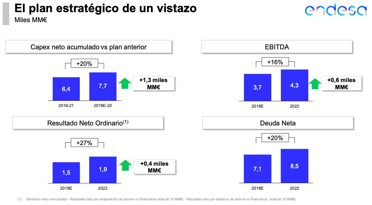 Endesa prevé ganar 1.500 millones de euros en 2019 (1,417 € por acción) y 1.600 millones en 2020 (1,51 € por acción). En tanto que la empresa prevé repartir la totalidad de los beneficios netos, el dividendo a cargo de 2019 sería de unos 1,417 €, de los que podría repartir 0,70 € en diciembre de 2019 y 0,717 € en junio o julio de 2020.