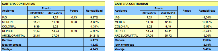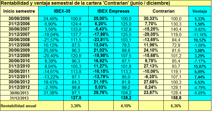 La Cartera Contrarian fue una selección de valores que se calculó en Invesgrama desde el 30 de septiembre de 2013 hasta el 31 de diciembre de 2019. En ese período obtuvo una rentabilidad del 9,59% anual, mientras que el IBEX 35 con dividendos ganó un 4,36% anual. Esta cartera fue propuesta en el libro Invertir Low Cost, de 2014, que cubría el período de marzo de 2006 a septiembre de 2013. En el histórico completo (marzo de 2006 a diciembre de 2019), la rentabilidad fue del 8,97% anual, frente al 3,23% del IBEX 35 con dividendos. Ver Rentabilidades históricas de las carteras de Invertir Low Cost.