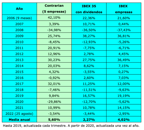 En 2022 (hasta el 25 de agosto), los diez valores más baratos por PER perdían un 1,14% y la Contrarian un 3,54%, casi lo mismo que el IBEX 35 (-3,44%).