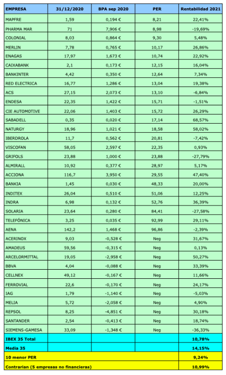 En 2020, los diez valores con menor PER generaron un resultado negativo del 29,61% y la que hubiera sido la cartera Contrarian habría perdido un porcentaje muy similar. En cambio, el IBEX 35 perdió un 12,70%.