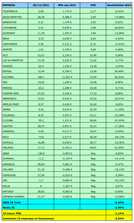En 2021, los diez valores con menor PER ganaron de media un 9,24% y la Contrarian un 10,99%, mientras que el IBEX 35 con dividendos obtuvo un 10,78%.