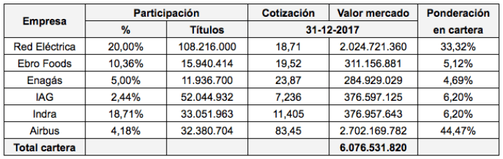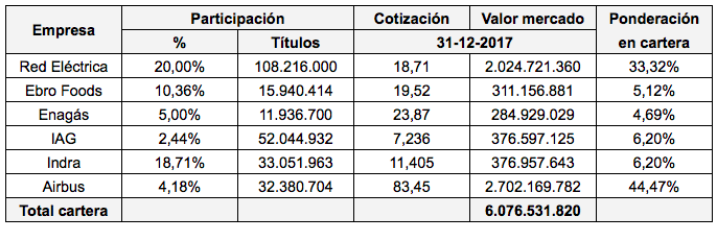 La tabla siguiente recoge la participación de la SEPI en cada una de las seis sociedades cotizadas en bolsa y su valor de mercado al cierre de 2017. Las participaciones principales son las de Airbus y Red Eléctrica, que suponían un 44,47% y un 33,32% respectivamente sobre el valor total de mercado del conjunto de participaciones, que era de 6.076,5 millones de euros.