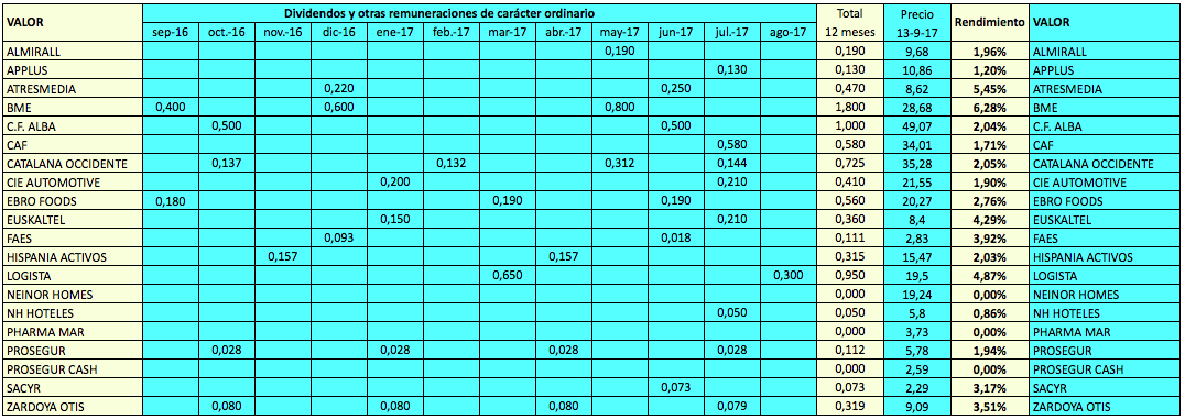 Con cargo al ejercicio 2016 repartió un dividendo a cuenta en diciembre del mismo año por un importe de 0,57 y un complementario de 0,87 que abonó en junio de 2017, lo que hace un total de 1,44 brutos y de 1,1664 netos. Con cargo a 2015 repartió 1,34 €.