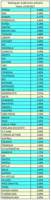 En el cuadro siguiente he ordenado los valores del IBEX 35 según las tres definiciones del PER que utilizo. El estándar tiene en cuenta el beneficio neto atribuido total y es el que se usa habitualmente. El base tiene en cuenta el beneficio neto de las operaciones continuadas y el recurrente descarta los resultados extraordinarios y las partidas atípicas. Los datos se basan en los precios al cierre del 1 de septiembre de 2017.