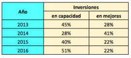 Hay que tener en cuenta que buena parte de las inversiones se destinan a incrementar la capacidad productiva o a mejoras de procesos. En 2016 las proporciones fueron del 51% y del 22% respectivamente. El resto de inversiones se destinó a mantenimiento y a energía, medio ambiente y seguridad.