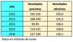 La tabla siguiente indica la evolución de los ingresos y de diferentes medidas de los beneficios de Viscofán de 2004 a 2016. Puede observarse que los ingresos se han multiplicado por 2,1 mientras que el beneficio operativo se ha multiplicado por 9,2. Eso revela que la empresa ha sido muy eficiente en su gestión.