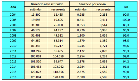 El beneficio por acción estándar ha pasado de los 0,285 € en 2004 a los 2,68 € en 2016, es decir se ha multiplicado por 9,4, lo que supone un aumento del 20,5% anual. El beneficio por acción recurrente aún ha crecido más, al haberse multiplicado por 10.