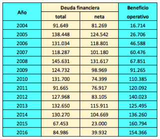 En la tabla podemos ver que el beneficio operativo no se ha conseguido a costa de aumentar la deuda financiera sino a pesar de que esta se ha mantenido más o menos constante a lo largo del período en términos absolutos. En términos relativos, la relación entre ambas variables es aún más favorable, tal como se indica en el apartado 2.6.