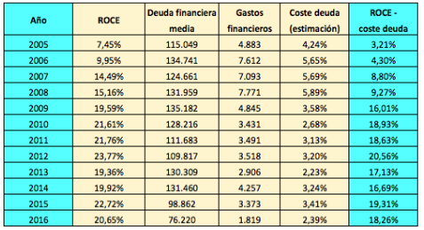 En la tabla siguiente se ha calculado la ROCE como el ratio entre el beneficio operativo recurrente y el capital empleado medio (la media entre el capital empleado al final del año anterior y el del año corriente). Se observa que la ROCE se incrementó en la primera mitad del período hasta alcanzar valores del 20-22%, que se ha mantenido hasta la actualidad. Es una cifra muy por encima de la media de las empresas cotizadas y más teniendo en cuenta que se trata de una ROCE recurrente.