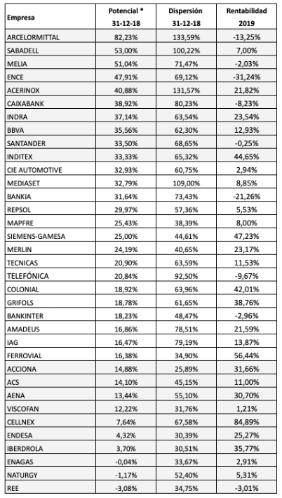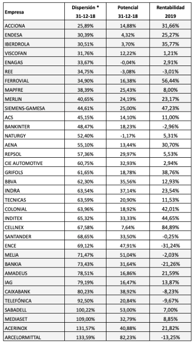 La tabla siguiente ordena los valores del IBEX 35 según su dispersión en el potencial de revalorización al final de 2018. Los diez valores con menor dispersión al final de 2018 fueron Acciona, Endesa, Iberdrola, Viscofán, Enagás, Red Eléctrica, Ferrovial, Mapfre, Merlin Properties y SIemens-Gamesa. Unicamente Red Eléctrica tuvo rentabilidad negativa en 2019.