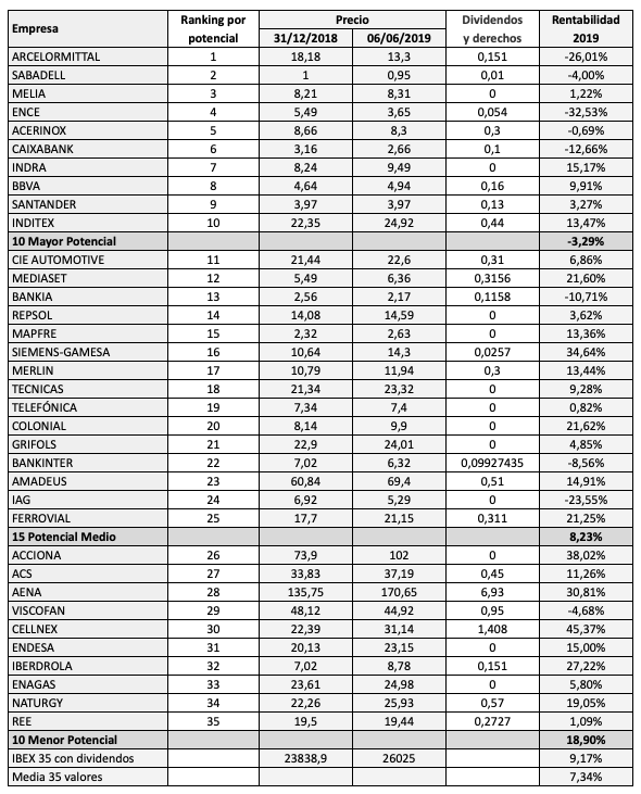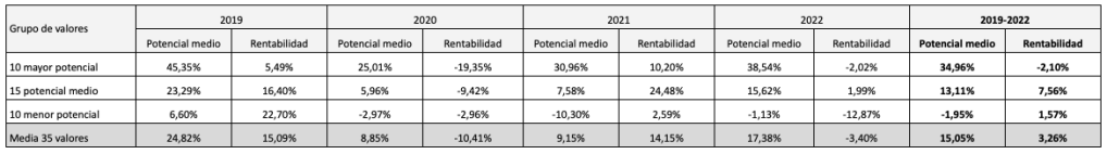 La tabla siguiente resume los resultados de los tres grupos de valores del IBEX 35 según su potencial de revalorización al principio de los años 2019 a 2024. El grupo de 10 con mayor potencial ganó un 11,08% anual en el período, dos puntos anuales más que la media de los 35 valores. El grupo de 15 con potencial medio fue el más rentable, con un 11,20% anual. Los 10 con menor potencial solo ganaron un 2,20% anual.
