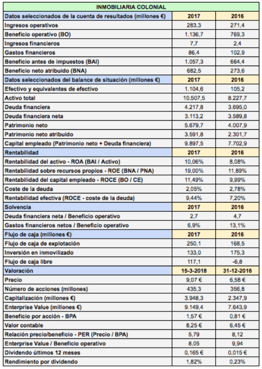 La inmobiliaria también informa del EBITDA (beneficio operativo más amortizaciones) recurrente, que alcanzó los 229 millones de euros, un 4% más que en 2016. Dado que las amortizaciones fueron de 2,45 millones de euros, el beneficio de explotación recurrente fue de 226,55 millones de euros, el 19,9% del total. En la tabla anterior puede verse que la relación entre los gastos financieros netos y el beneficio de explotación, un criterio clave de solvencia, fue del 6,9%. Sin embargo, si tomamos como referencia el beneficio de explotación recurrente, dicho ratio es del 34,7%, en el límite de lo aceptable.
