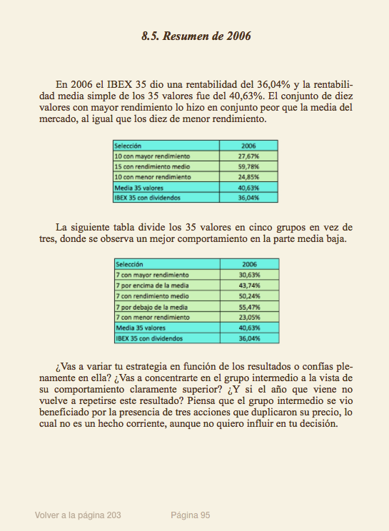 Incluye también un estudio sobre los valores del IBEX 35 desde enero de 2006 hasta mayo de 2020, presentado como un juego. Para cada año hay un ranking de los valores del IBEX 35 ordenados según su rendimiento el 1 de enero (o sea, en base al precio de cierre del año anterior). Seguidamente hay una “tabla de pistas“ que indica gráficamente la situación de cada empresa en una serie de ratios financieros para ayudar al lector a hacer su propia selección de valores. A continuación se encuentra una tabla con la rentabilidad de cada valor al finalizar el año, de modo que el lector podrá calcular el resultado de su cartera, y un resumen con la rentabilidad media de las acciones del IBEX 35 divididas en grupos según su rendimiento al inicio del año.