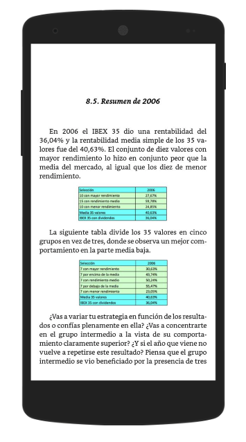 A continuación reproduzco algunas páginas tal como se ven en una tablet y en un móvil. Debido a la presencia de tablas, se recomienda el uso de una tablet u ordenador. En un móvil de pantalla grande se puede leer bien pero en ocasiones es útil tener dos páginas en la misma pantalla para cotejar el texto con los datos de la tabla pertinente.