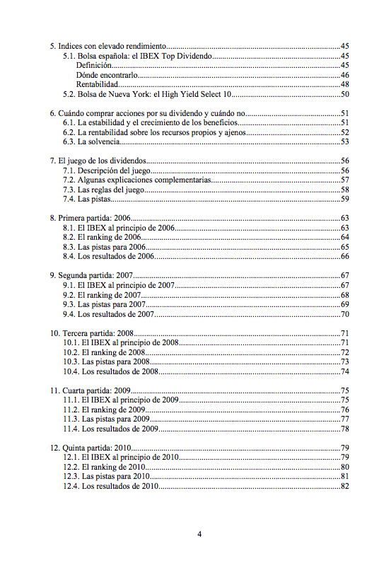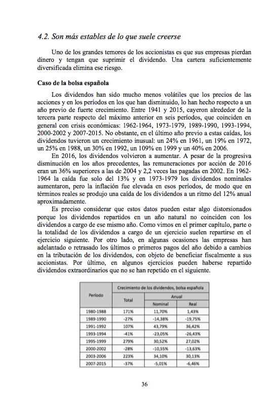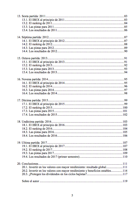 El capítulo final recoge una serie de conclusiones sobre qué grupo ha sido más rentable (los valores con rendimientos más altos, medios, etc.) en el período de enero de 2006 a diciembre de 2019, así como el resultado que se obtiene cuando en la selección de acciones aplicamos además un filtro basado en la estabilidad de los beneficios. También se analiza si los dividendos protegen en los ciclos bajistas.