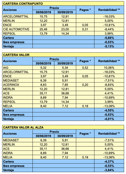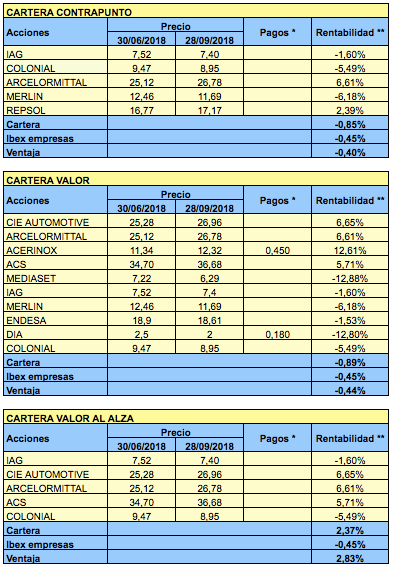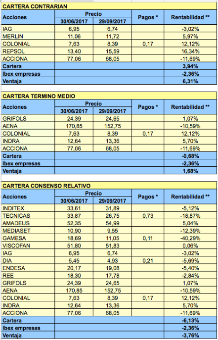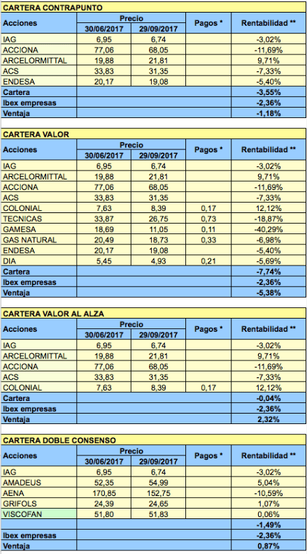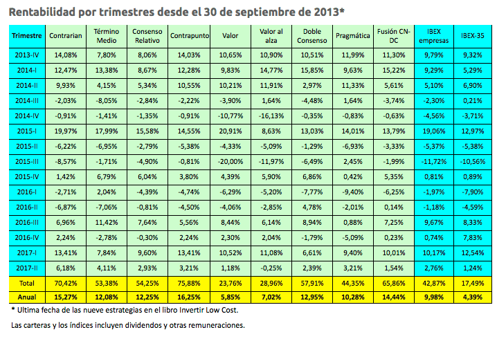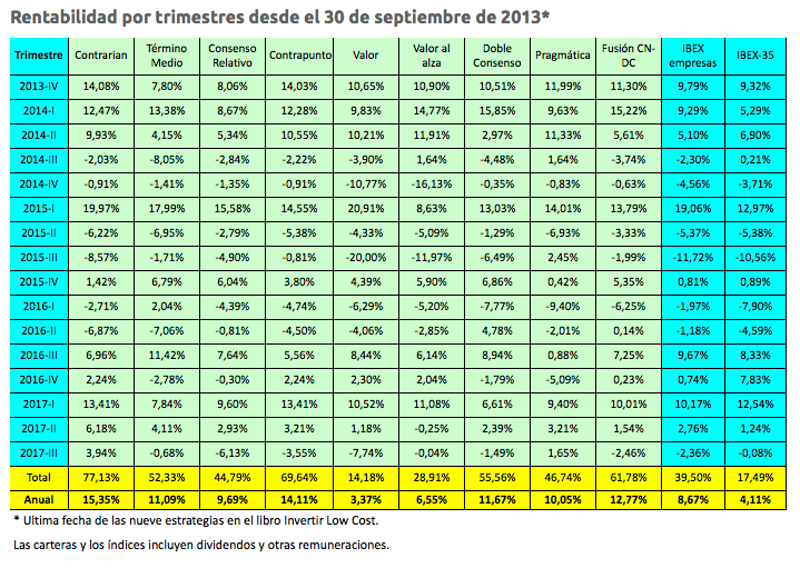 La tabla siguiente recoge la rentabilidad trimestral de las carteras desde el 30 de septiembre de 2013, última fecha de las mismas en mi libro Invertir Low Cost. El IBEX Empresas y el IBEX 35 incluyen dividendos.