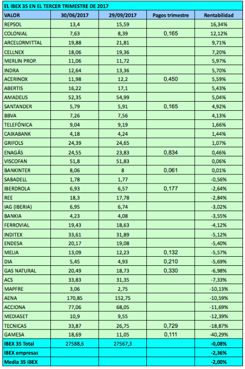 Este trimestre, Inmobiliaria Colonial, que se sumó al IBEX 35 en junio en sustitución de Banco Popular, entra en buena parte de las carteras ya que el valor cumple los criterios de selección relevantes de acuerdo con las cuentas presentadas por la empresa según las normas financieras internacionales. Sin embargo, hay que tener en cuenta que prácticamente todo el beneficio de Colonial se basa en revalorizaciones de activos, lo cual distorsiona los ratios financieros utilizados, incluyendo los de rentabilidad corporativa y solvencia.