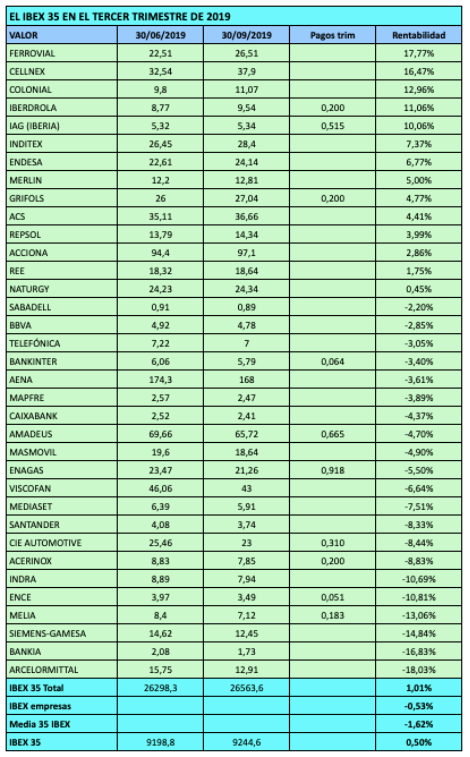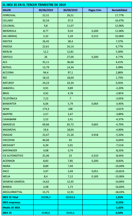 Inditex, Técnicas Reunidas, Amadeus, Mediaset, Gamesa, Viscofán, IAG, DIA, Endesa, Red Eléctrica, Grifols, Aena, Colonial, Indra y Acciona.