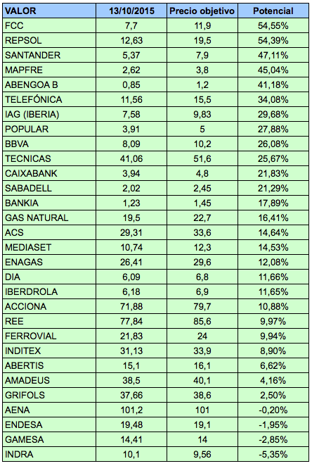 El banco y broker también establece unos precios objetivos para la mayoría de valores del IBEX. En algunos casos parecen demasiado optimistas, pero el tiempo dirá. He ordenado los valores del IBEX-35 (para los cuales el banco da un precio objetivo) según el potencial de revalorización con los precios del 13 de octubre.