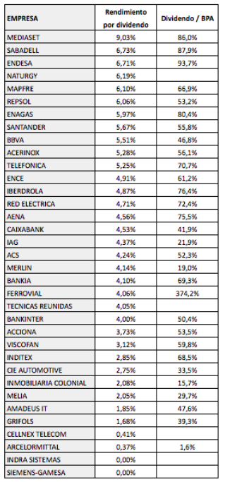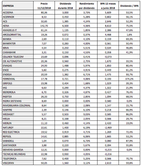 La tabla siguiente recoge el rendimiento de cada componente del IBEX 35 de acuerdo con los dividendos ordinarios pagados a lo largo de 2018 y los derechos de suscripción vinculados a un dividendo ordinario. Se incluyen los pagos confirmados o esperados en lo que queda de año. La última columna indica el porcentaje de distribución o payout, calculado como el cociente del dividendo ordinario repartido en 2018 y el beneficio por acción interanual entre junio de 2017 y junio de 2018.