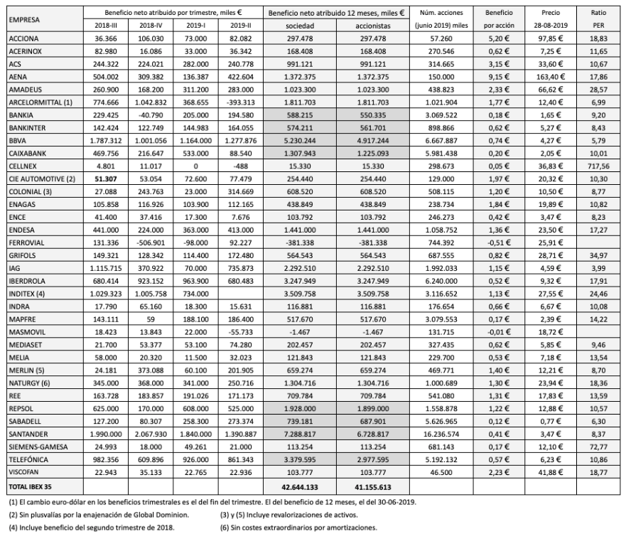 La tabla siguiente recoge los beneficios netos trimestrales de las compañías del IBEX 35 en los últimos cuatro trimestres (del tercero de 2018 al segundo de 2019), así como el beneficio neto acumulado entre junio de 2018 y junio de 2019. En el caso de Inditex no se conocen aún los resultados del segundo trimestre de 2019, de modo que el acumulado a junio de 2019 es en realidad el de 12 meses hasta marzo de 2019.