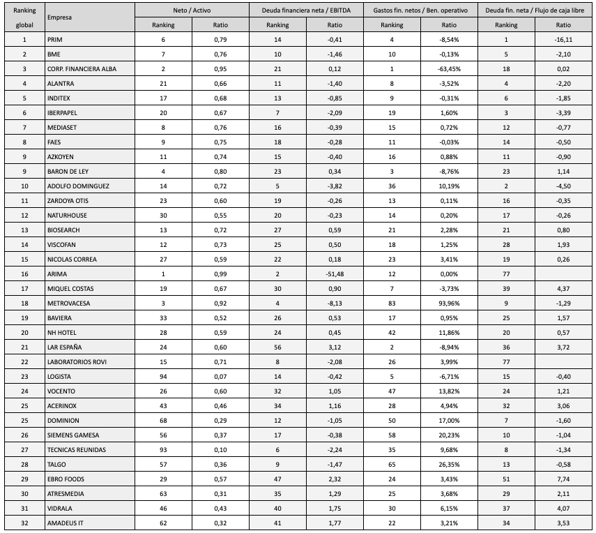 La primera de las tablas siguientes ordena los valores del IBEX según el ratio de solvencia que relaciona la deuda financiera neta a 30 de junio de 2019 y el beneficio operativo entre el 31 de julio de 2018 y el 30 de junio de 2019. En el caso de Inditex y Mediaset el ratio es negativo porque la deuda financiera de ambas empresas es menor que sus disponibilidades de efectivo.