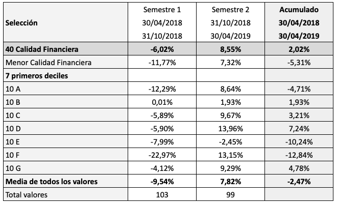 Los primeros 40 valores del ranking forman el índice Calidad Financiera 40. Del 30 de abril de 2018 al 30 de abril de 2019, este índice ganó un 2,02% con dividendos, mientras que los valores con menor calidad (alrededor de 60) perdieron una media del 5,31%. El mejor grupo fue el formado por los valores que ocuparon las posiciones 31 a 40, pues ganó un 7,24%.