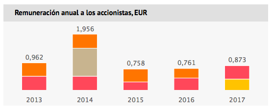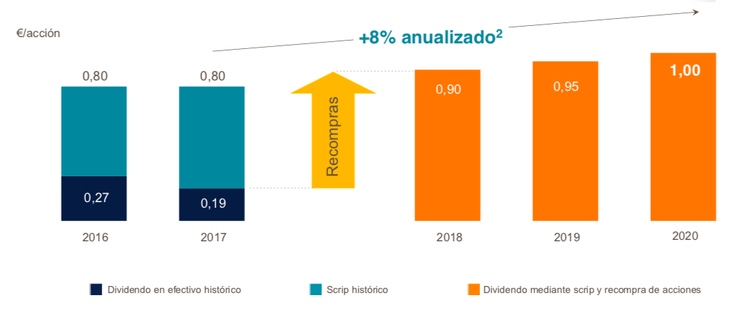Por tanto, el patrimonio neto atribuido a los accionistas es de 28.740 millones de euros en 2017, lo que corresponde a un valor contable de 18,53 €, un 3,5% inferior al “oficial“.