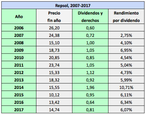 La acción de Repsol ha sido un 12% menos rentable que el IBEX 35 con dividendos desde 2006. Cien euros invertidos en títulos de la petrolera en diciembre de 2006 se habrían convertido en 96,3 € después de impuestos sobre dividendos mientras que en el IBEX 35 habrían crecido a 109,8 €.