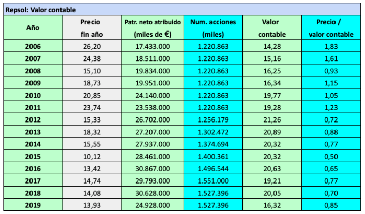El valor contable de una acción es el patrimonio neto atribuido dividido por el número de acciones del capital social. La acción de Repsol ha cotizado por debajo de ese valor intrínseco desde 2012, y en los años precedentes lo hizo en niveles cercanos. A finales de 2015 la acción presentó un descuento récord del 50%.