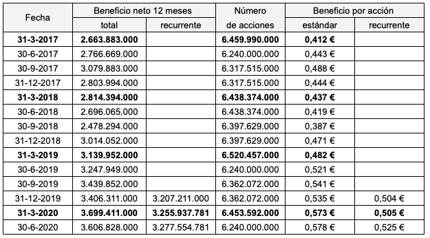 El beneficio por acción fue de 0,61 € y el beneficio por acción ajustado, que es una mejor referencia, de 0,582 €.