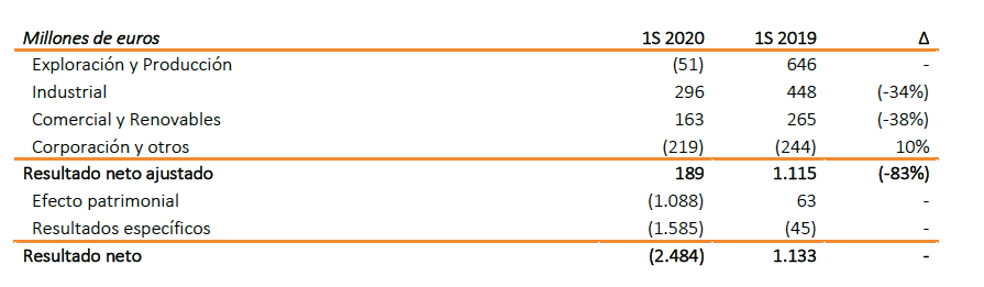 El resultado neto ajustado, que no incluye partidas extraordinarias, fue positivo en 189 millones €, aunque en el segundo trimestre fue negativo en 258 millones € (en el primer trimestre fue positivo en 447 millones €). Repsol cargó 1.088 millones por el impacto de la caída del precio de las materias primas en la valoración de sus inventarios y 1.585 millones € por saneamientos contables en los activos de Exploración y Producción como consecuencia de unos precios esperados de crudo y gas más bajos en el futuro a raíz de la crisis de la pandemia. Ambas partidas extraordinarias dieron lugar a las pérdidas de 2.484 millones € antes indicadas.