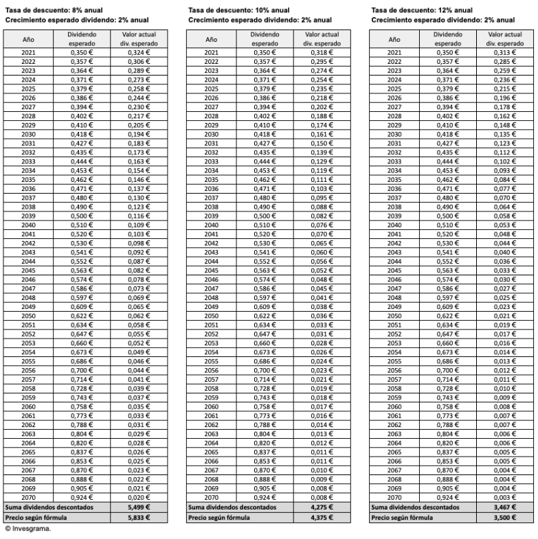 Ahora supongamos que partimos de un dividendo inicial de 0,30 €, que es el previsto por la propia compañía entre diciembre de 2021 y junio de 2022. Con un crecimiento esperado del 2% anual, el precio resultante es de 3,664 € con la suma de los valores descontados y de 3,75 € con la fórmula simple. Esto es un 14% menos que los 4,375 € que resultaban para un dividendo inicial de 0,35 €. Vemos así por qué unas acciones pueden caer en esa magnitud si una empresa anuncia un recorte del dividendo. De hecho, 0,30 € es un 14% menos que 0,35 €.