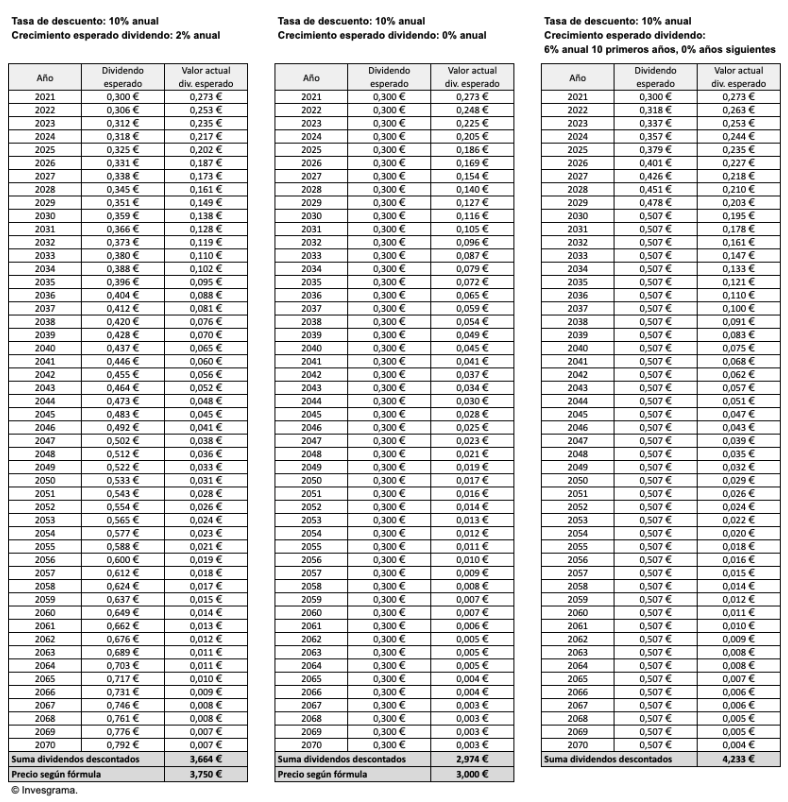 Probaré con diferentes tasas de crecimiento del dividendo: un 2%, un 0% y un 4% anual. En el caso de estimar un dividendo inicial de 0,30 €, estimaré el precio con una tasa del 6% en los diez primeros años y otra del 0% anual en los años siguientes.