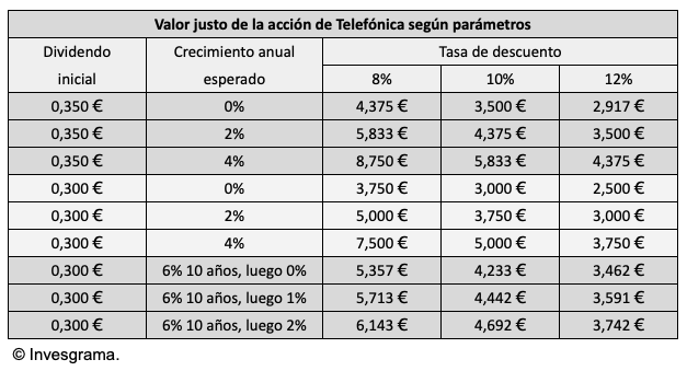Si el crecimiento esperado fuera del 0% anual, o sea que el mercado esperara que el dividendo de Telefónica se mantendrá inalterado en los 0,35 € por tiempo indefinido, el valor justo sería de 3,5 € para una tasa de descuento del 10%. Es decir, si el precio fuera de 3,5 €, la rentabilidad (bruta) anual de la acción de Telefónica sería del 10% anual, si se cumpliera la expectativa de un mantenimiento indefinido del dividendo.