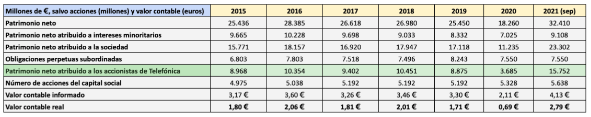 En septiembre de 2021, las obligaciones perpetuas subordinadas ascendían a 7.550 millones €. Por tanto, el patrimonio neto realmente atribuible a los accionistas en 2021 fue de 15.157 millones €, lo que (a la espera de conocer el dato de diciembre de 2021, que se publicará en el informe anual) da un valor contable de 2,62 €.
