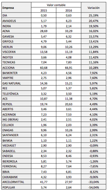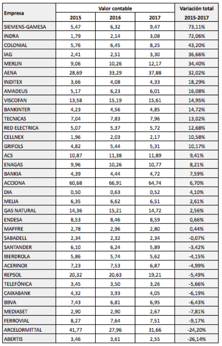 Evolución del valor contable de las empresas del IBEX 35, 2015-2017 (revisado)