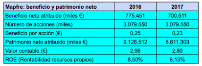 La aseguradora Mapfre redujo su valor contable de los 2,96 € de 2016 a los 2,80 € en 2017. Actualmente cotiza a 2,73 €: a pesar de dicha reducción, el precio está un 2,5% por debajo de su valor contable. Normalmente las sociedades cotizadas en bolsa tienen un precio superior a su valor en libros, de modo que uno puede preguntarse si esta situación es normal.
