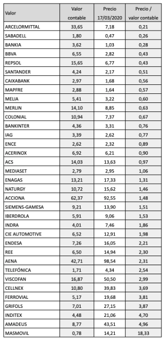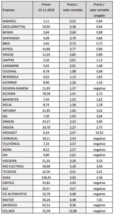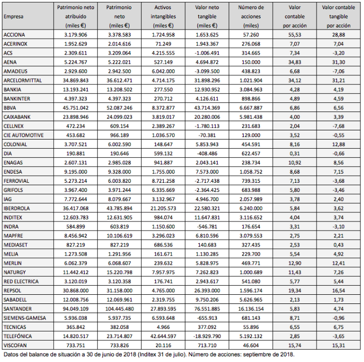 En la tabla siguiente se indica el valor contable (que incluye los intangibles) y el valor contable tangible de las sociedades del IBEX 35. Los datos se han calculado a partir de las magnitudes relevantes del balance de situación al 30 de junio de 2018 y del número de acciones del capital social en septiembre de 2018 más las acciones con efectos potencialmente dilutivos (pero no se ha restado la autocartera).