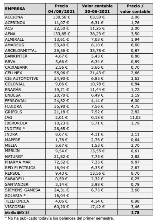 La última columna de la tabla indica la relación entre el precio al cierre del 4 de agosto de 2021 y el valor contable. A falta de los datos de Inditex y Solaria, las empresas del IBEX 35 cotizan de media 2,78 veces su valor contable.