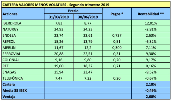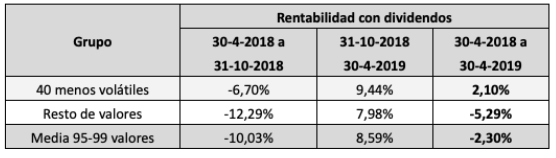 En lo que llevamos de 2019, en cambio, los 40 valores menos volátiles se están quedando rezagados. Al día de hoy ganan un 1,90% frente al 6,27% de la media del mercado. Aún así, siguen conservando una ventaja apreciable desde abril de 2018.