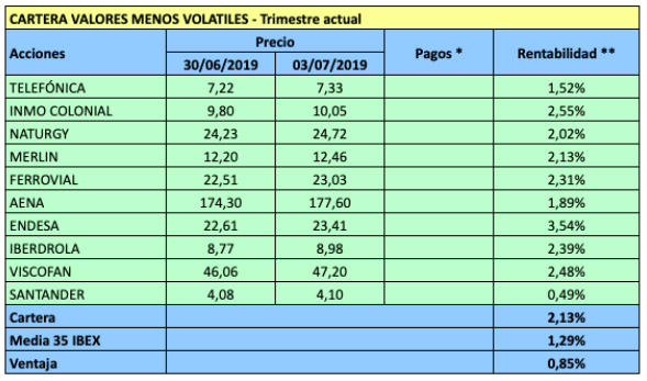 La cartera 10 Valores Menos Volátiles está compuesta este trimestre por Naturgy, Viscofán, Red Eléctrica, Enagás, Iberdrola, Telefónica, Ferrovial, Mapfre, Grifols y Endesa. El día 26 de noviembre perdió un 2,27% (ver cuadro siguiente), menos de la mitad del 4,94% que se dejó el índice con dividendos.
