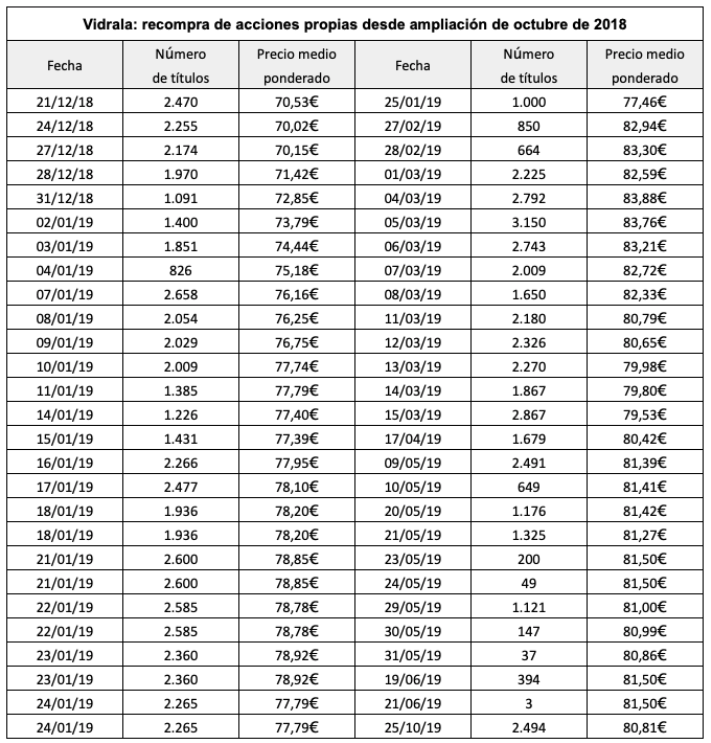El lunes 28 de octubre, Vidrala inició una ampliación de capital liberada que asigna a cada accionista una acción gratuita por cada 20 acciones. Por ejemplo, un inversor que el viernes 25 de octubre tuviera 200 acciones, tiene derecho a 10 acciones gratuitas. Las acciones nuevas pueden suscribirse hasta el 11 de noviembre incluido.