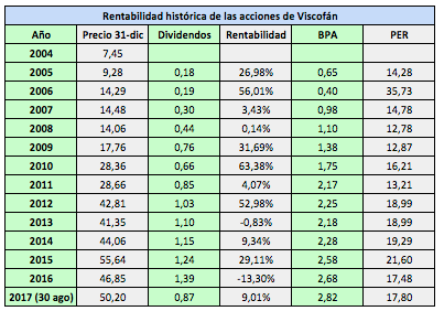 Teniendo en cuenta un impuesto del 18% sobre los dividendos, cien euros invertidos en acciones de Viscofan el 31 de diciembre de 2004 se habrían convertido en 808 € en diciembre de 2016, casi cinco veces más de lo que se habría obtenido al invertir en una cartera de valores representativa del Indice General de la Bolsa de Madrid (IGBM).